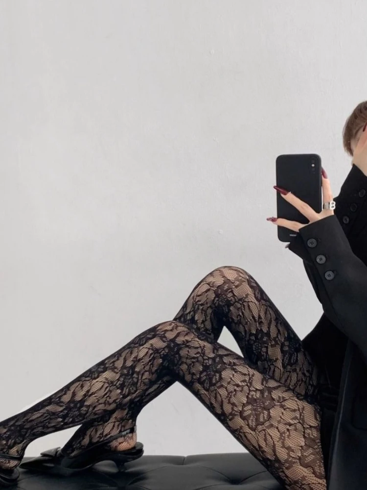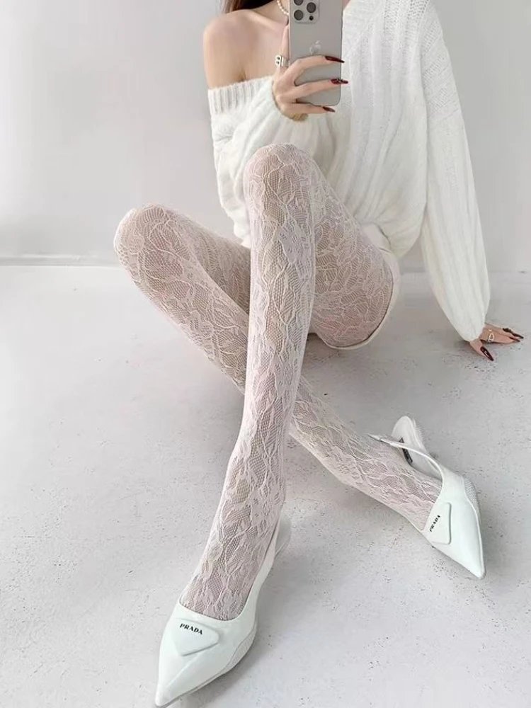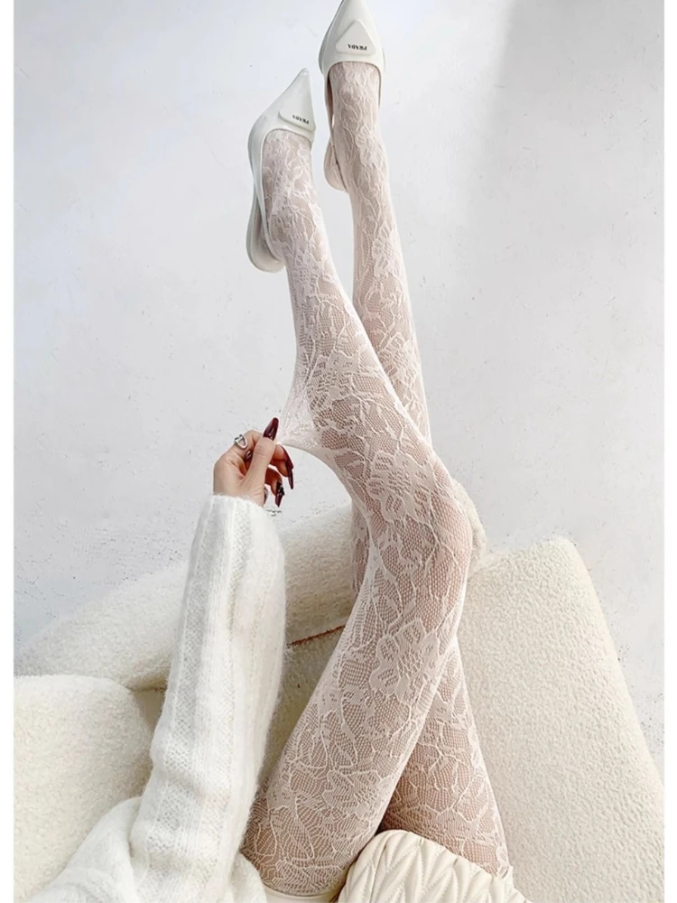 White Socks Women Sexy Fishnet Stockings Femme Summer Thin Flower Mesh Pantyhose Elastic Slimming High Waist Hollow Out Tights